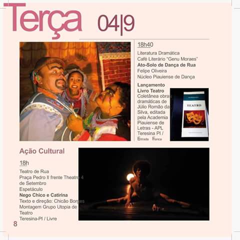 Seguindo o quinto dia da programação do aniversário do Theatro 4 de Setembro, teremos às 18hrs, na praça Pedro II o espetáculo “Nego Chico e Catirina”. E às 18h40, acontecerá Literatura Dramática no Café literário “Genu Moraes” com Ato-Solo de dança de rua e também o lançamento do Livro “Teatro”, uma coletânea de obras dramáticas do Júlio Romão da Silva.