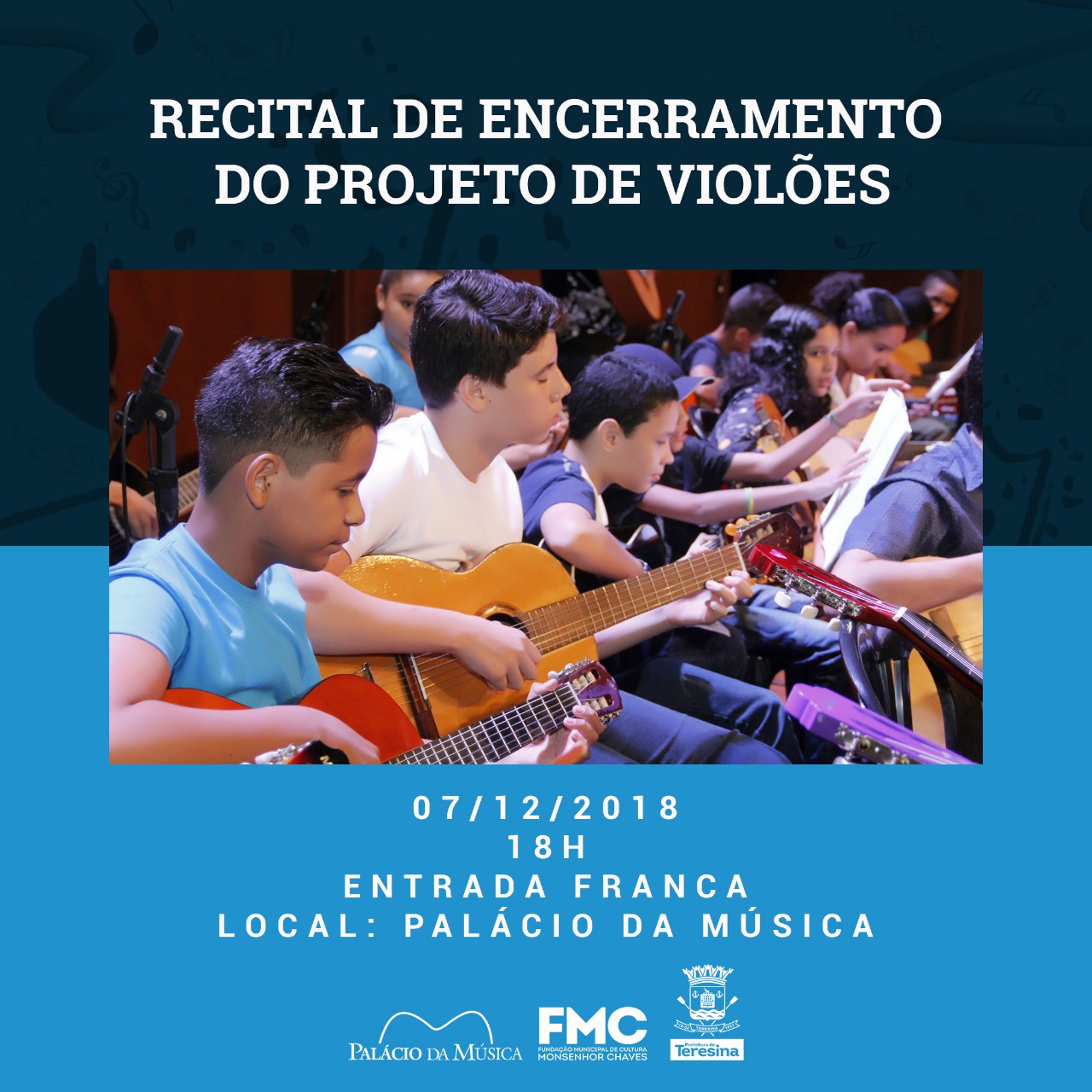 Nesta sexta, 07 de dezembro, a partir das 18hrs, no Palácio da Música, terá um recital de encerramento do projeto de violões. Não fique de fora dessa!!!