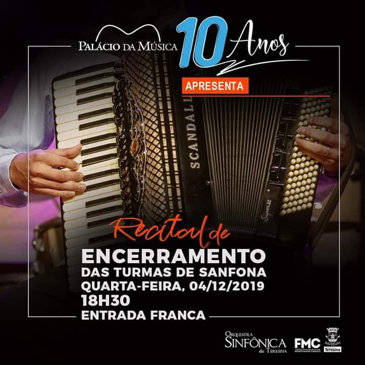 Hoje tem recital de encerramento das turmas de sanfona do Palácio da Música. As matrículas para novos alunos iniciam no dia 21 de janeiro, de 8h-12h, e custam R$ 50,00 (taxa única).