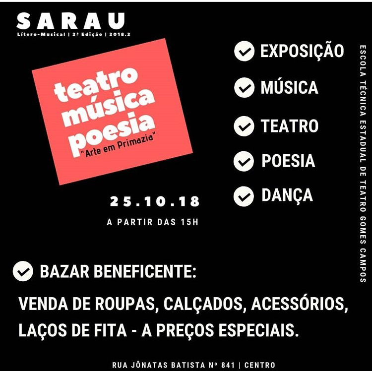 Amanhã, 25 de outubro a Escola Técnica Estadual de Teatro Gomes Campos realiza o primeiro Sarau Litero-Musical “Arte em Primazia”. O evento cultural será das 15hrs às 21hrs, esse espaço será realizado para que as pessoas possam se encontrar, expressar e/ou manifestar artisticamente. O Sarau Litero-Musical “Arte em Primazia” é uma realização do Núcleo de Estudos Dramático – NED, sob coordenação geral de Giselle Tôrres. Ocorrerá apresentações de alunos e convidados, são eles: Reação do Gueto, Preto Kedé, MC AC, Joanne e Jaísa, Luíza Miranda, Coral da Gomes Campos e Paulo Sousa. O evento também contará com praça de alimentação, bazar beneficente, exposição, intervenção artística e multimídia.