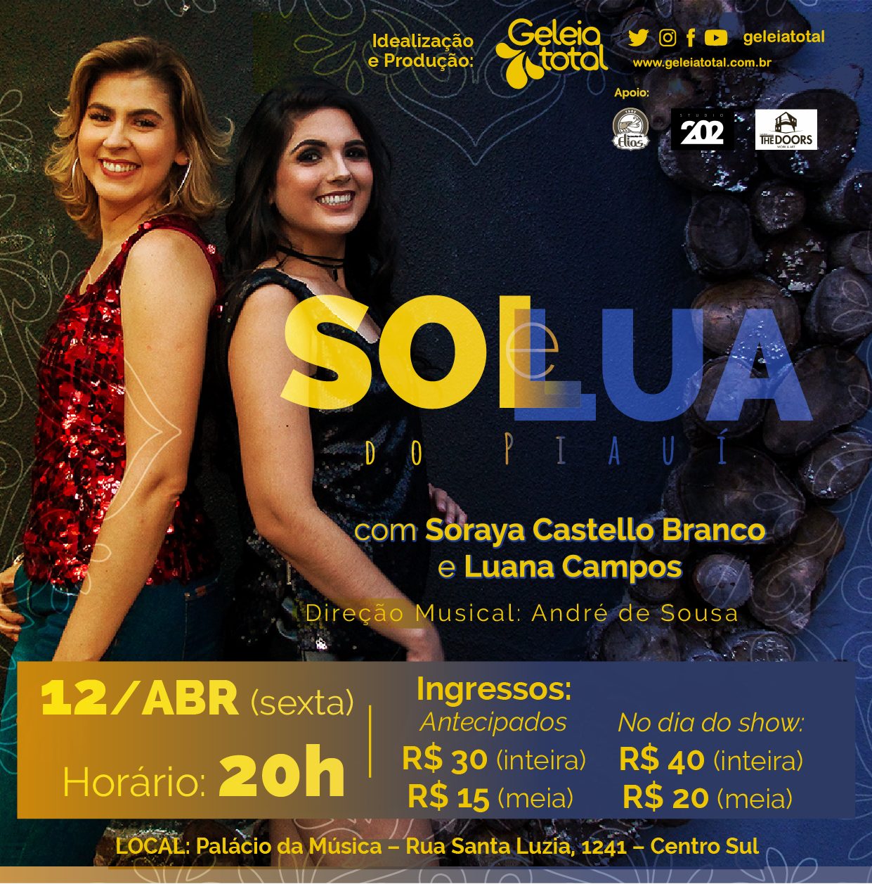 O show Sol e Lua do Piauí, idealizado e produzido pela Geleia Total, vem com uma proposta de unir duas grandes intérpretes do Piauí, Soraya Castello Branco (Sol) e Luana Campos (Lua), com estilos musicais bem diferentes, para interpretarem juntas um repertório 100% autoral piauiense. Ritmos misturados, uma Geleia Total de estilos pensados especialmente para mostrar o quão diverso somos, nós piauienses. O encontro das duas artistas representa a pluralismo de um povo que já nasceu diverso. Sol e Lua do Piauí tem um pouco de tudo, vai da veia do rock da Luana Campos ao ecletismo tropical da Soraya Castello Branco. O show conta com a direção musical do grande guitarrista, compositor e arranjador André de Sousa.