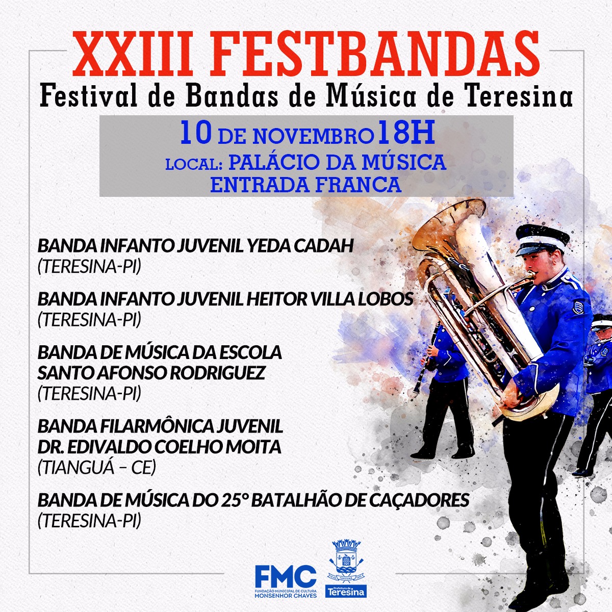 O Festival de Bandas de Música de Teresina chega em 2018 em sua 23ª edição, completando 30 anos de formação musical profissional em todo o estado do Piauí. O festival, será, às 18hrs, no Palácio da Música, com entrada franca.