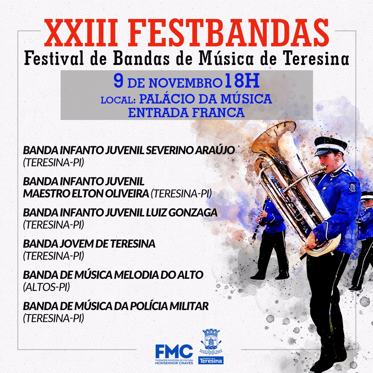 O Festival de Bandas de Música de Teresina chega em 2018 em sua 23ª edição, completando 30 anos de formação musical profissional em todo o estado do Piauí. O festival, será, às 18hrs, no Palácio da Música, com entrada franca.